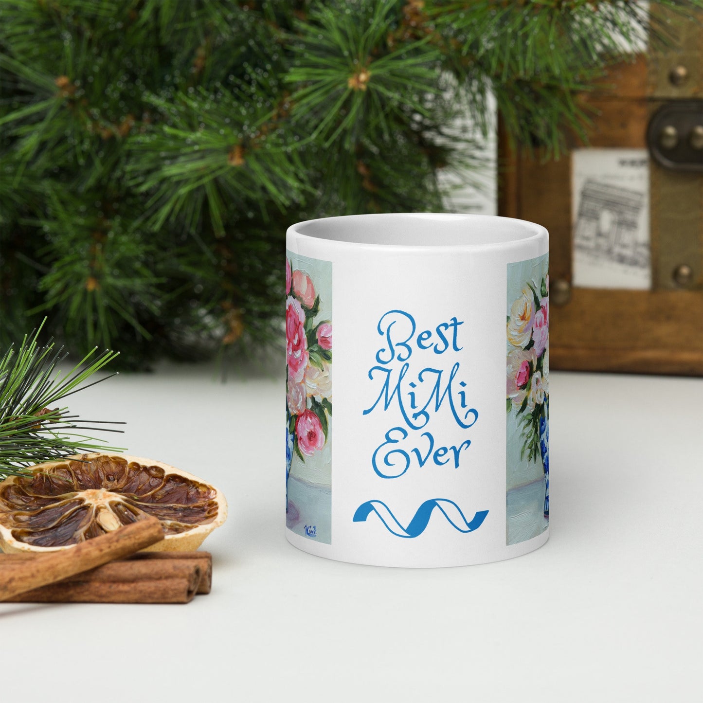 Your best MiMi ever deserves this beautiful mug featuring the blue & white vase with roses artwork of popular artist Kim Peterson. Let her know how special she is! Whether drinking her morning coffee, evening tea, or something in between— this mug's for her! It's sturdy and glossy with a vivid print that'll withstand the microwave and dishwasher.