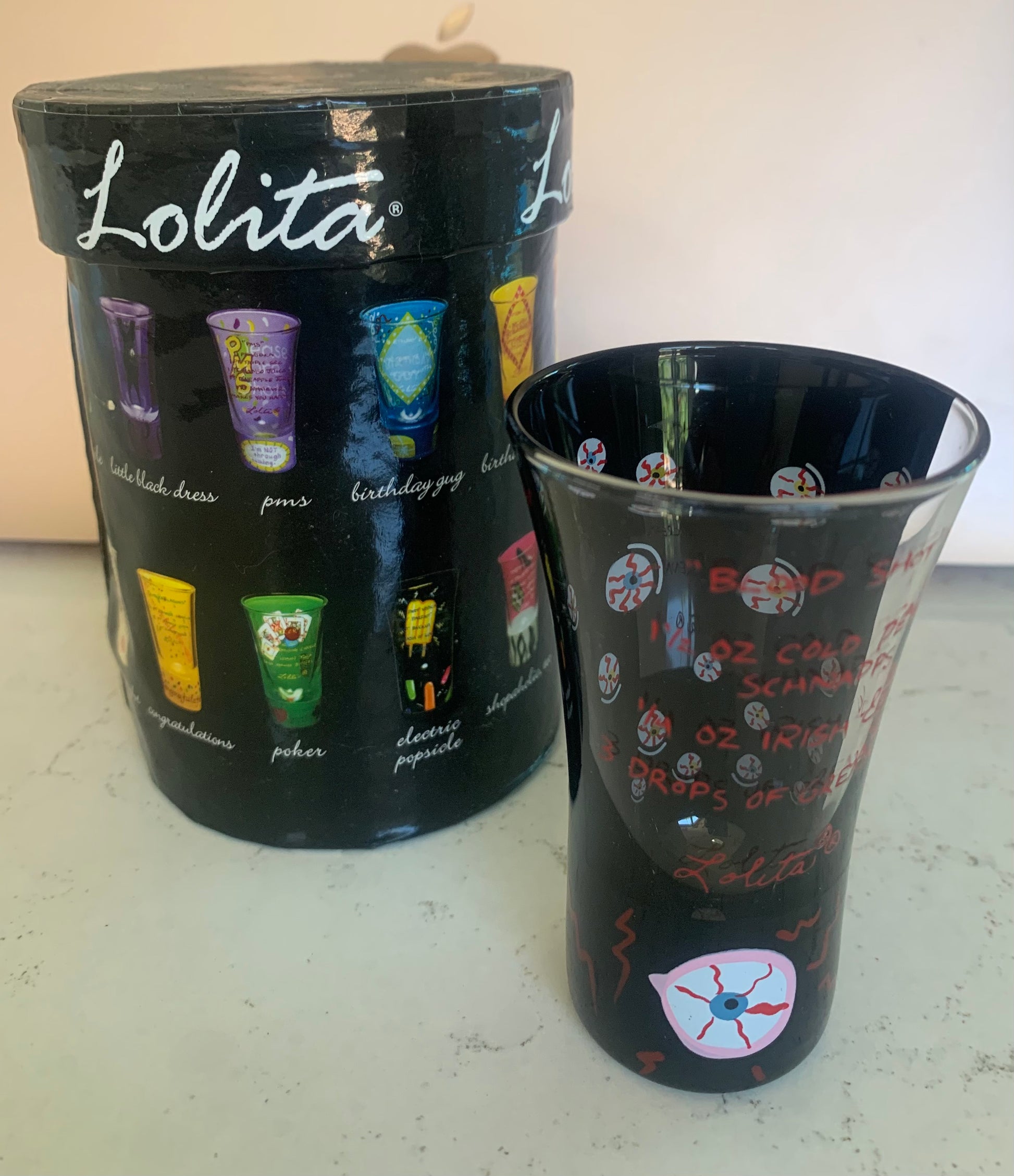 Lolita hand painted Blood Shot 2 ounce halloween shot glass with unique licensed drink recipe on the bottom Great fun for the Halloween month ofOctober !