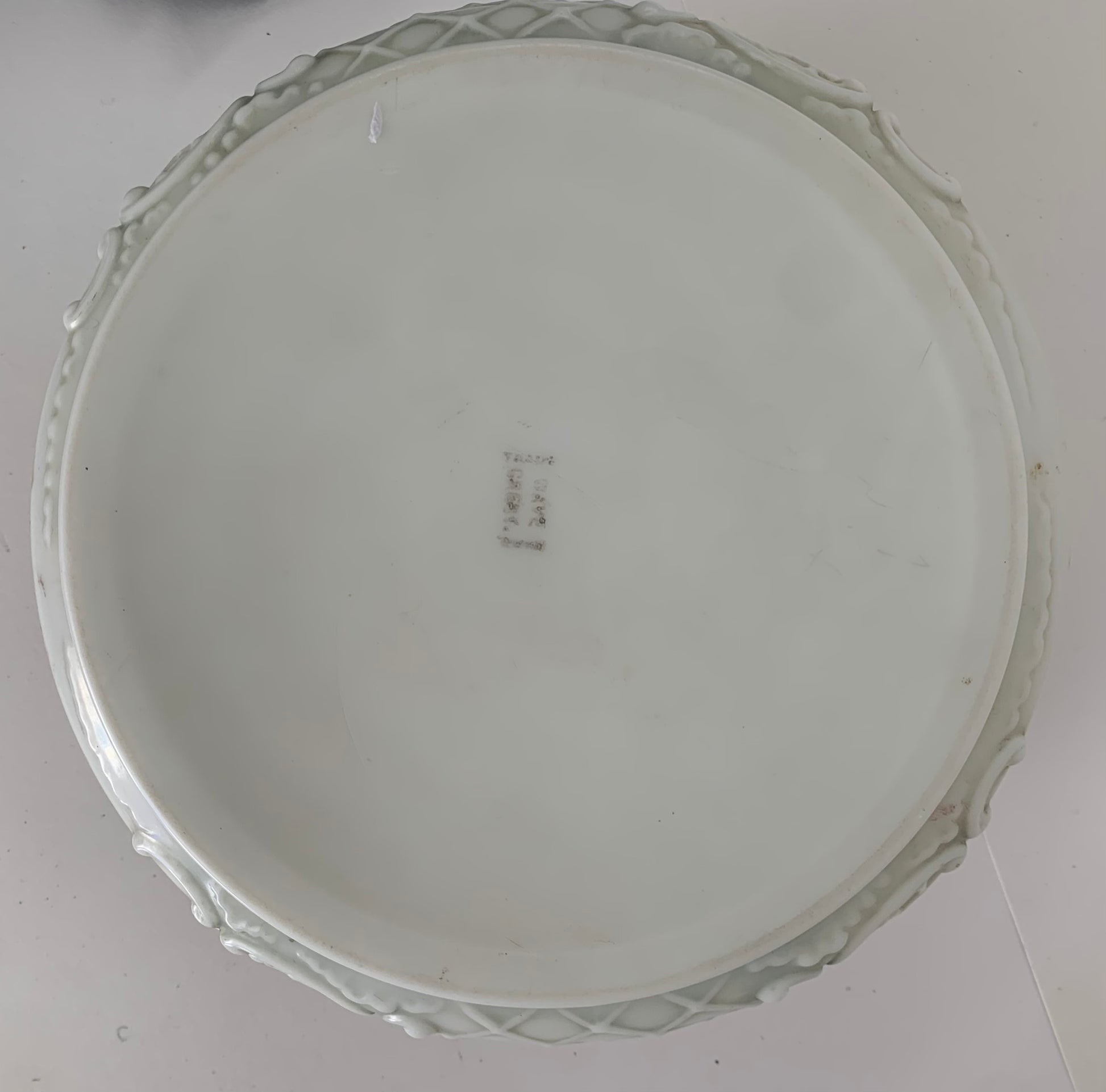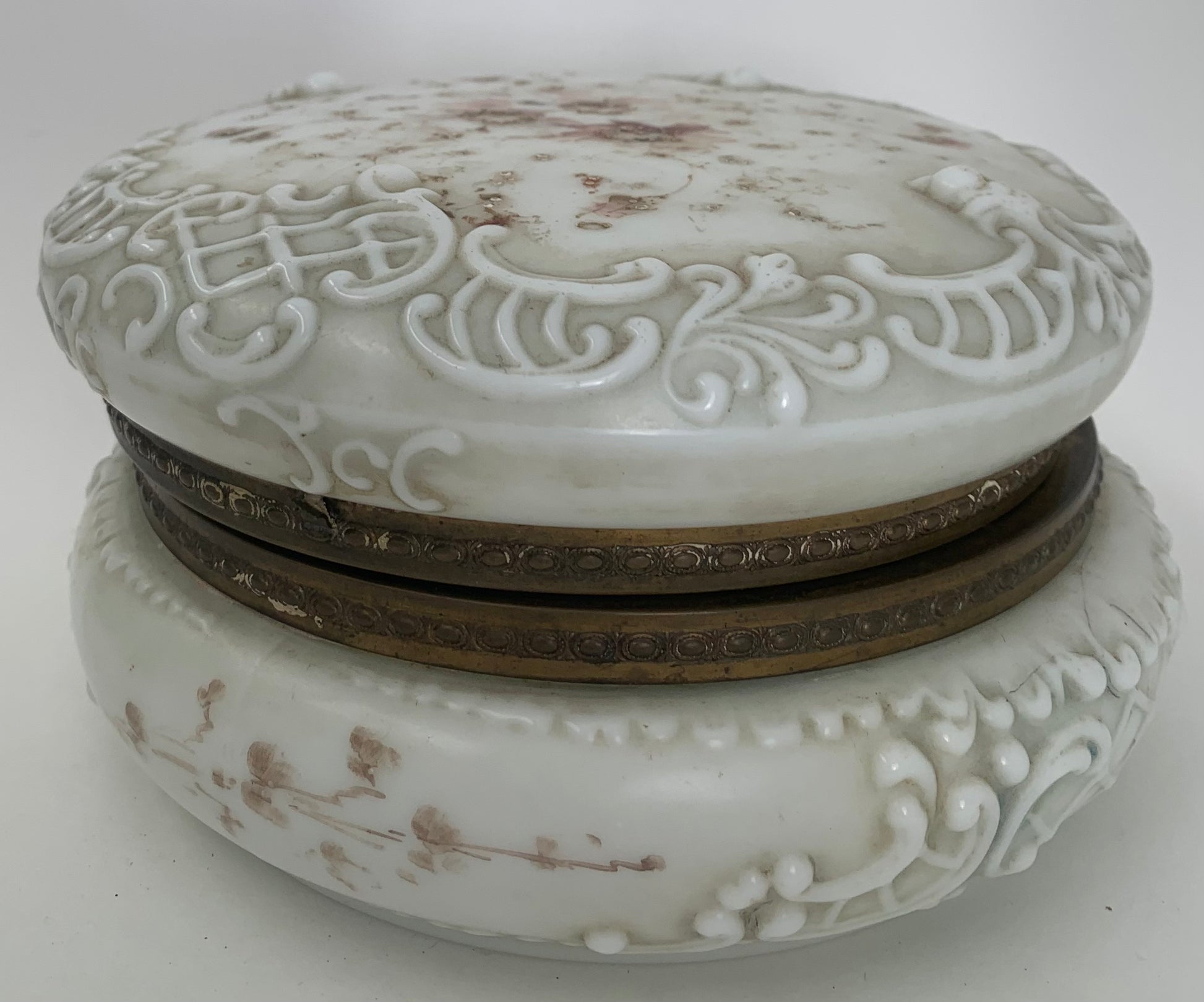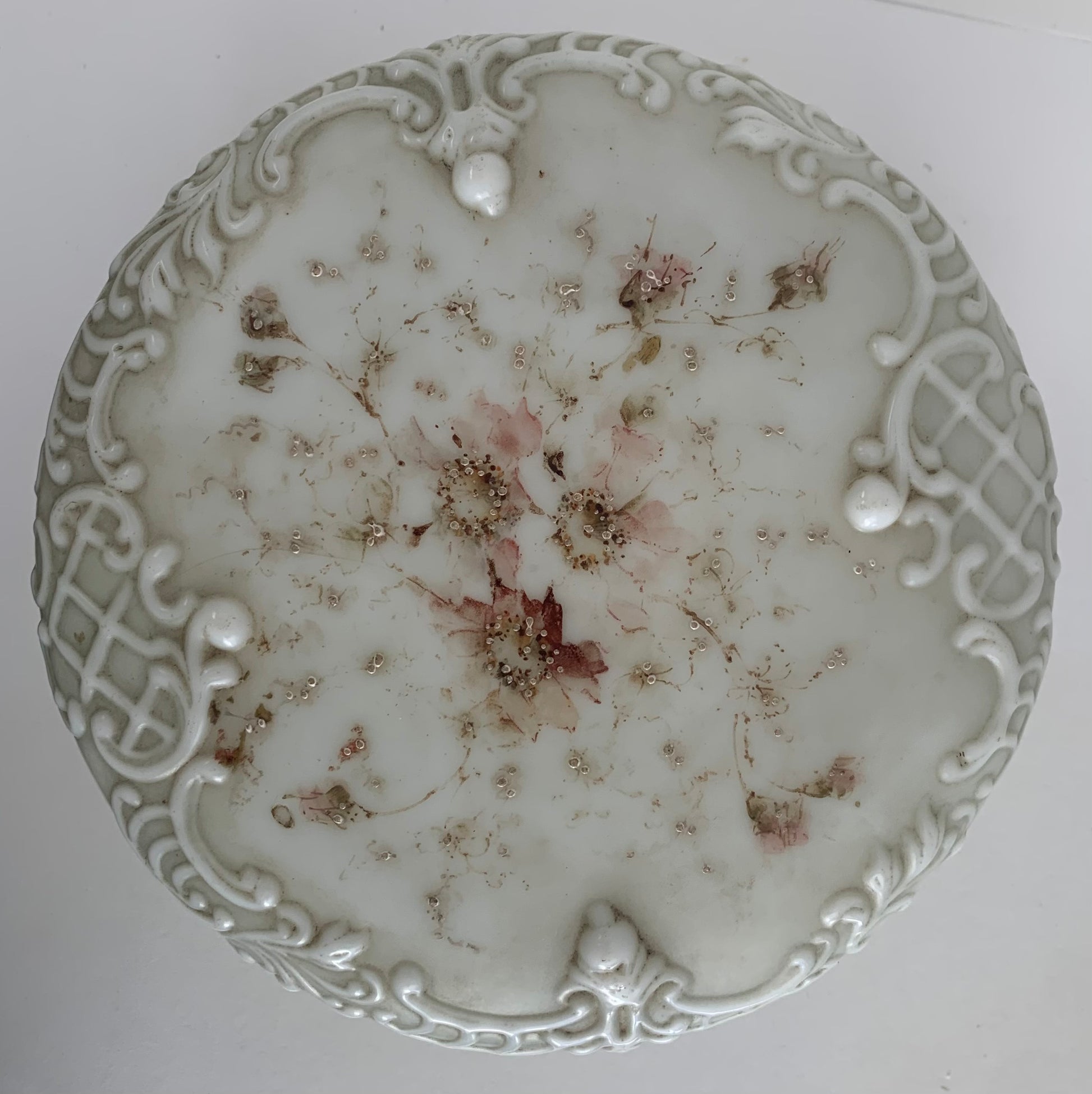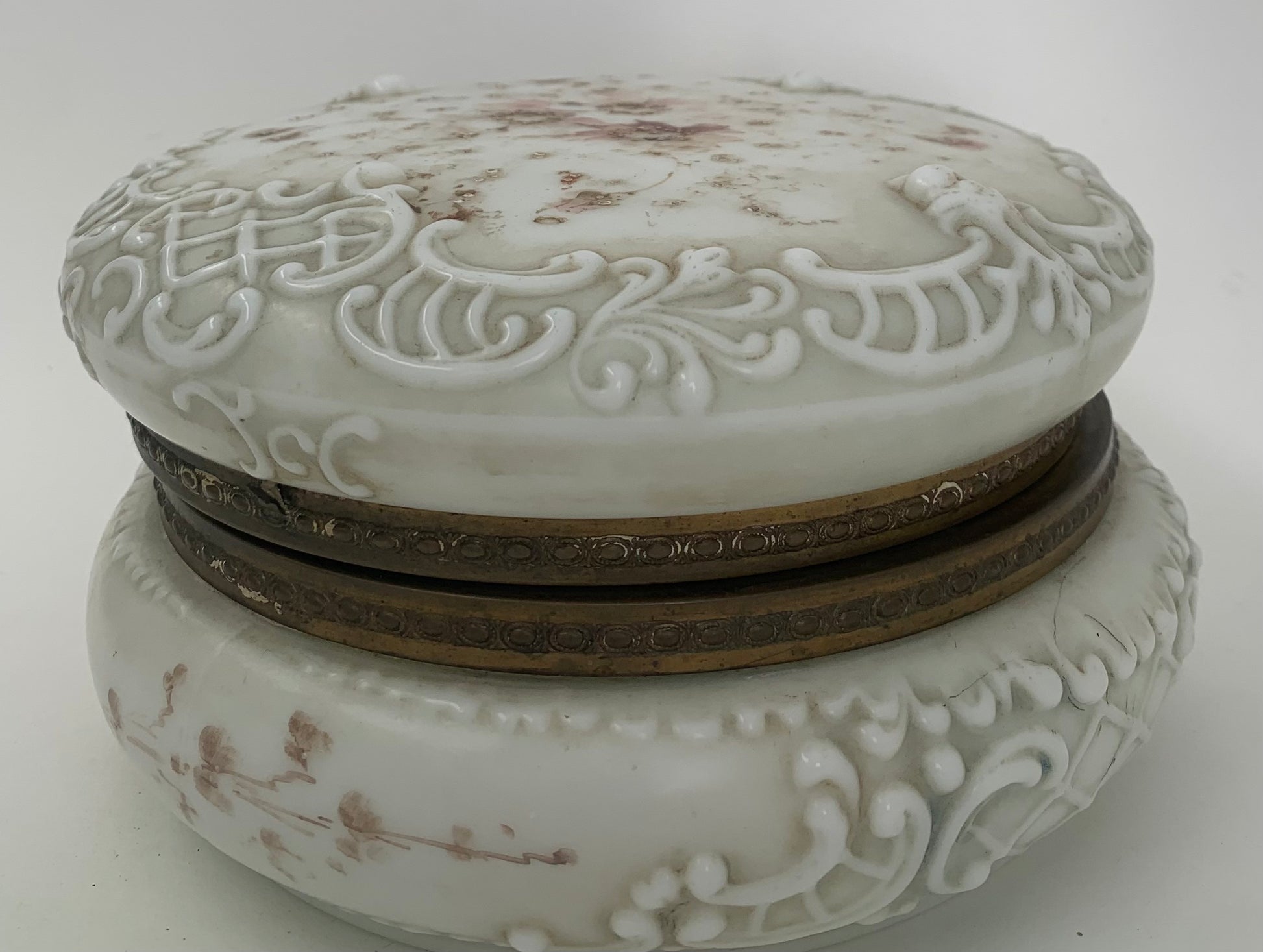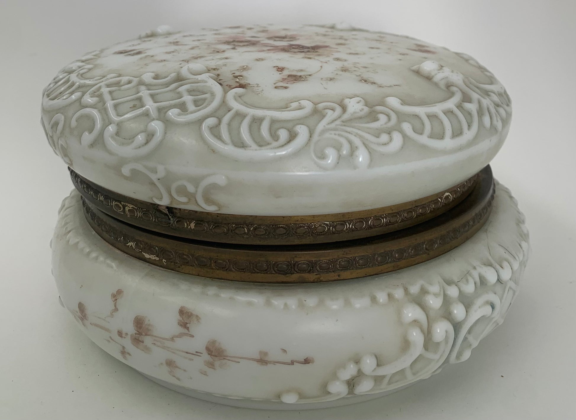 Wave Crest Glass was produced as an opal glass blank and then hand decorated. Originally called "Opal Ware" this glass was the its most popular in the late 1800s . This beautiful dresser box is in very good condition with no chips or cracks, the hand-painting floral design is faded but in otherwise good condition. A real treasure! 7" Dia x 3"H
