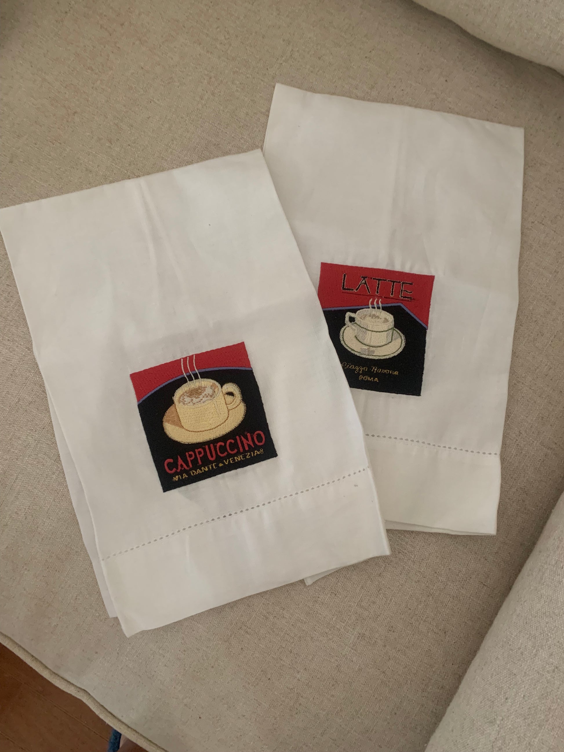 Yes we found a bunch of fun embroidered linen towels for a steal! Capuccino and Latte embroidered on cotton linen ....great gift for a coffee lover or add to a coffee basket! Pair these with the espresso and mocha towels for a fab set of four towels