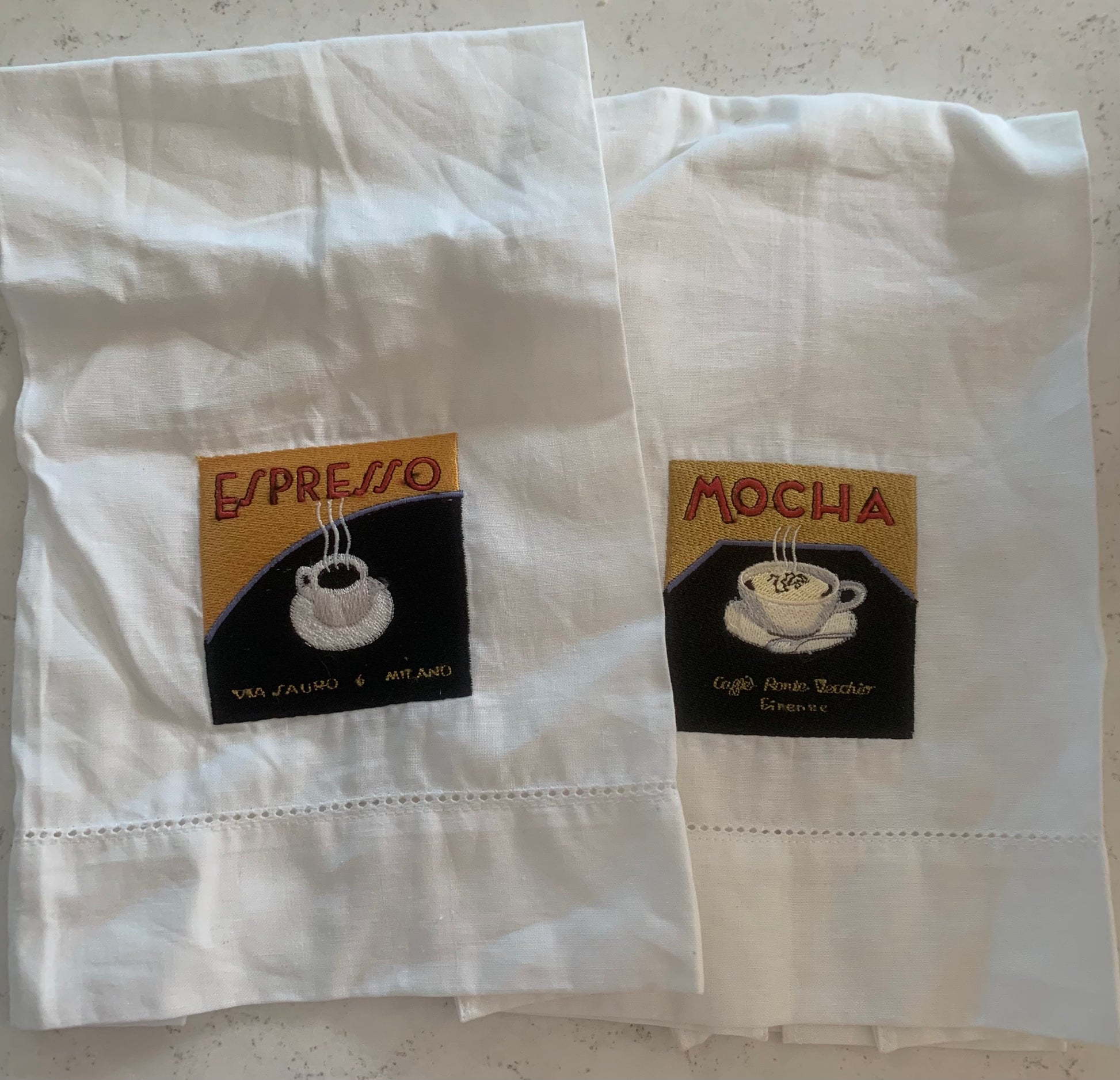 Yes we found a bunch of fun embroidered linen towels for a steal! Espresso and Mocha embroidered on cotton linen ....great gift for a coffee lover or add to a coffee basket!