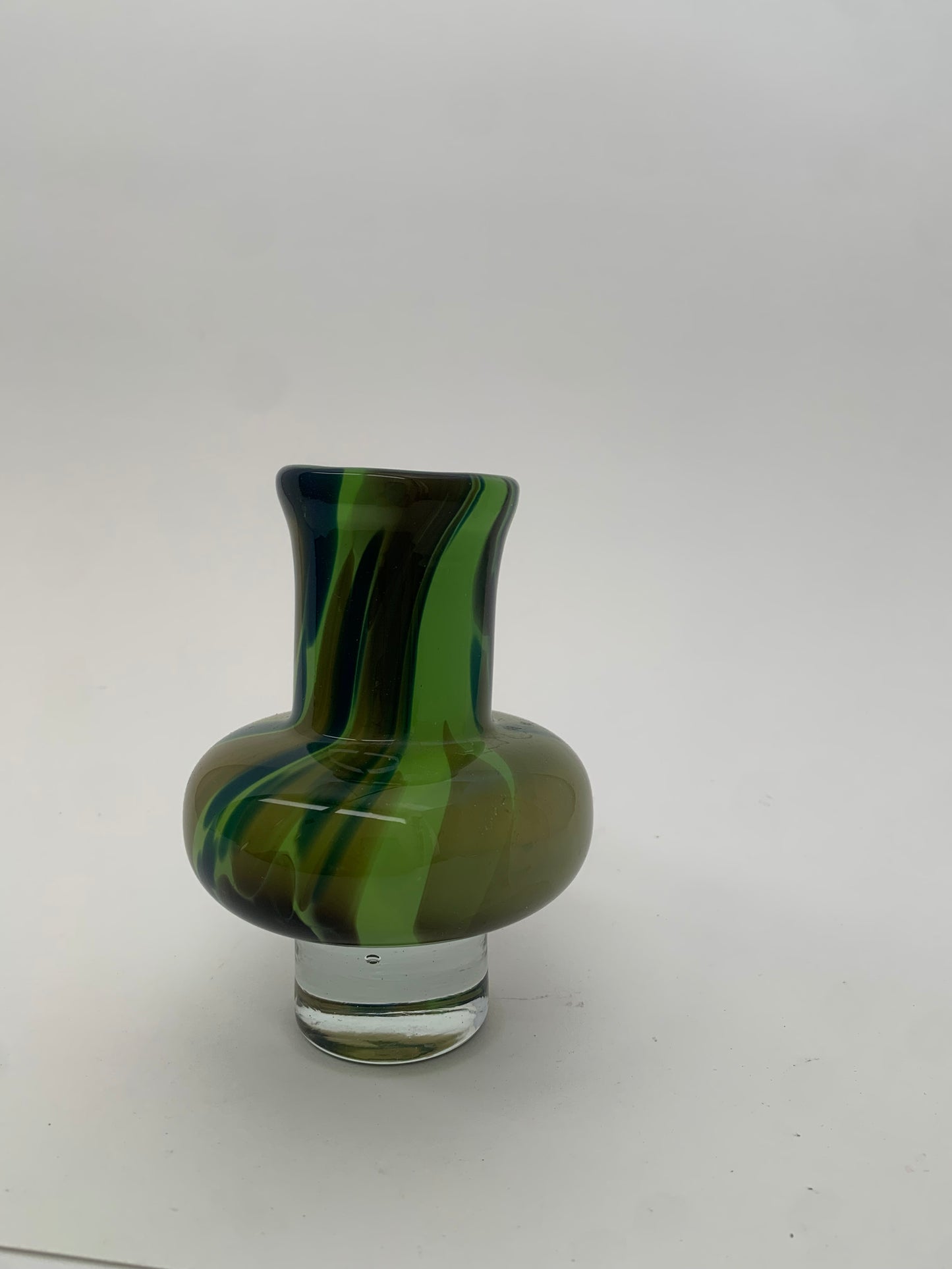 This is our latest thrift shop find, we actually had people following us around the store wanting to buy it from us and we saved it for you all! Art glass handblown vase measures 6"H x 5" Dia. Beautiful mix of greens with the lovely vase, great as a display piece as well on your "bookshelf wealth" shelves!