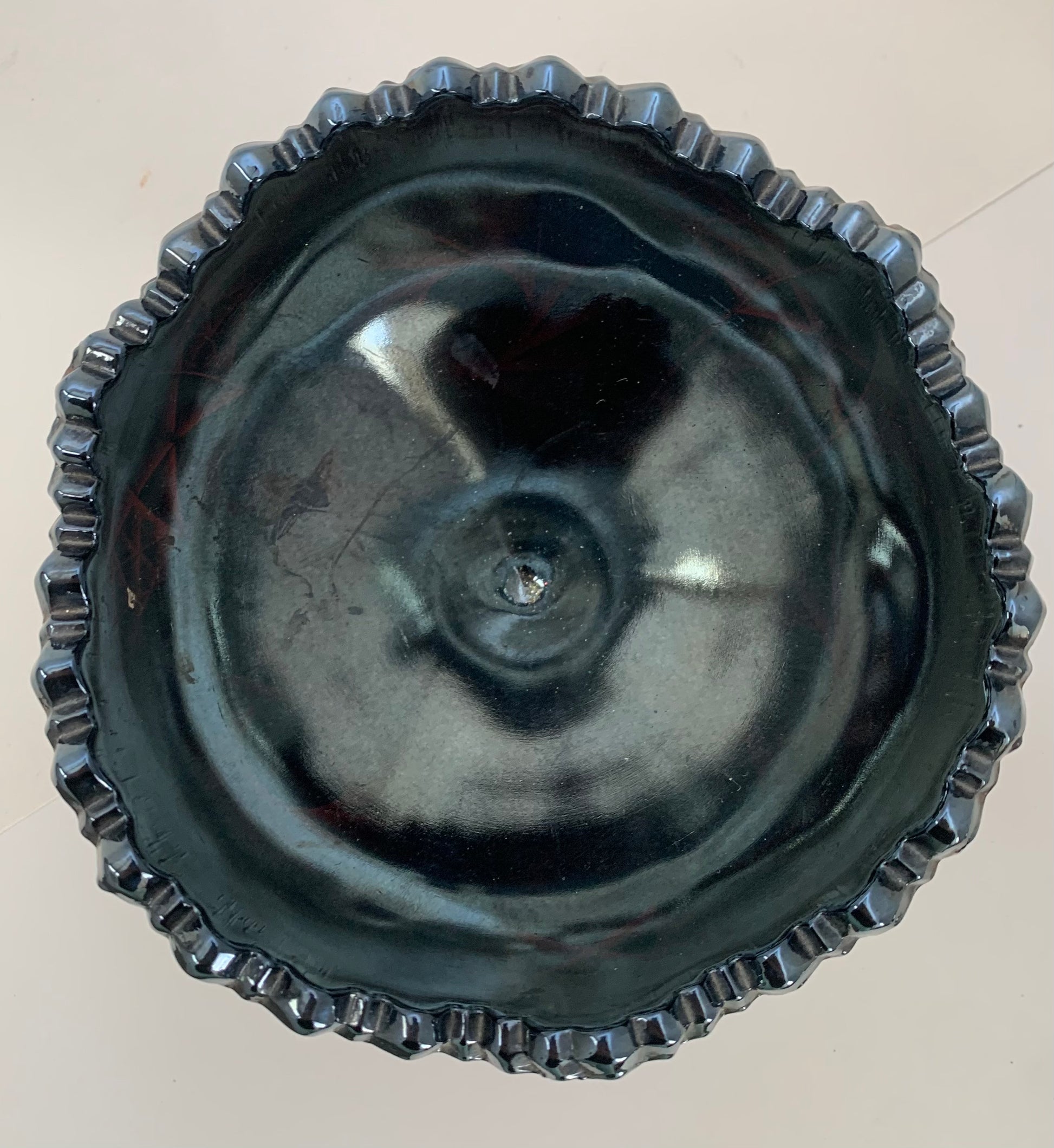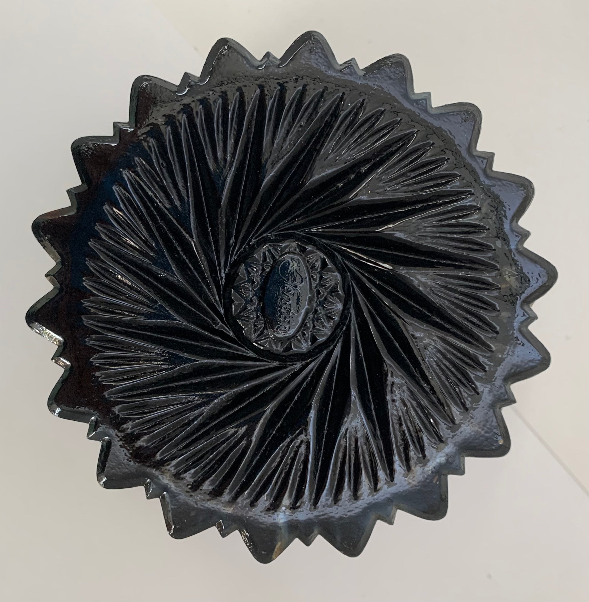 Vintage Fenton Amethyst Carnival Glass pedestal bowl/ candy bowl with sawtooth edging and pinwheel design Beautiful as a candy bowl or as a vase or fruit bowl. Measures 6" Dia x 5"H