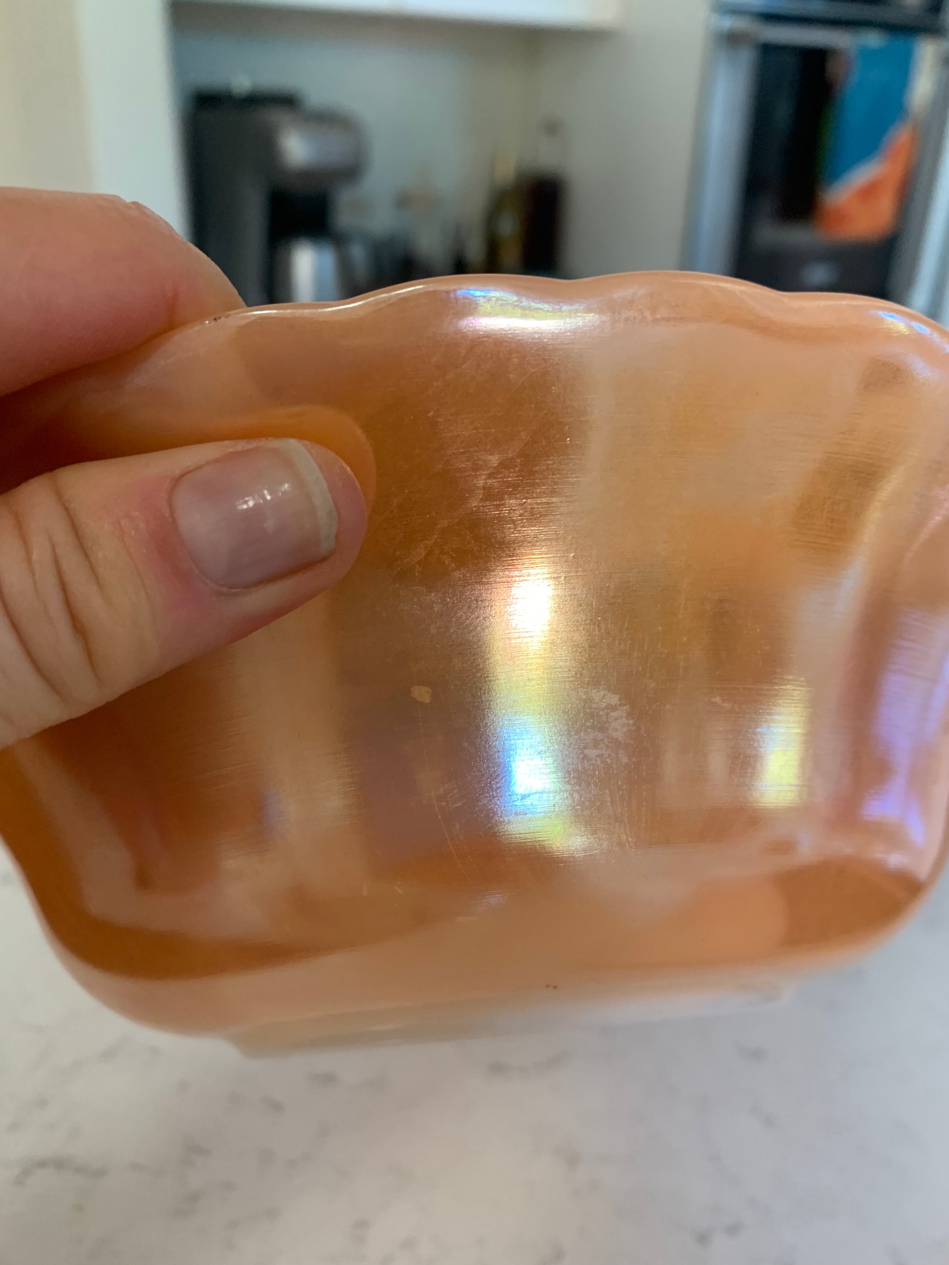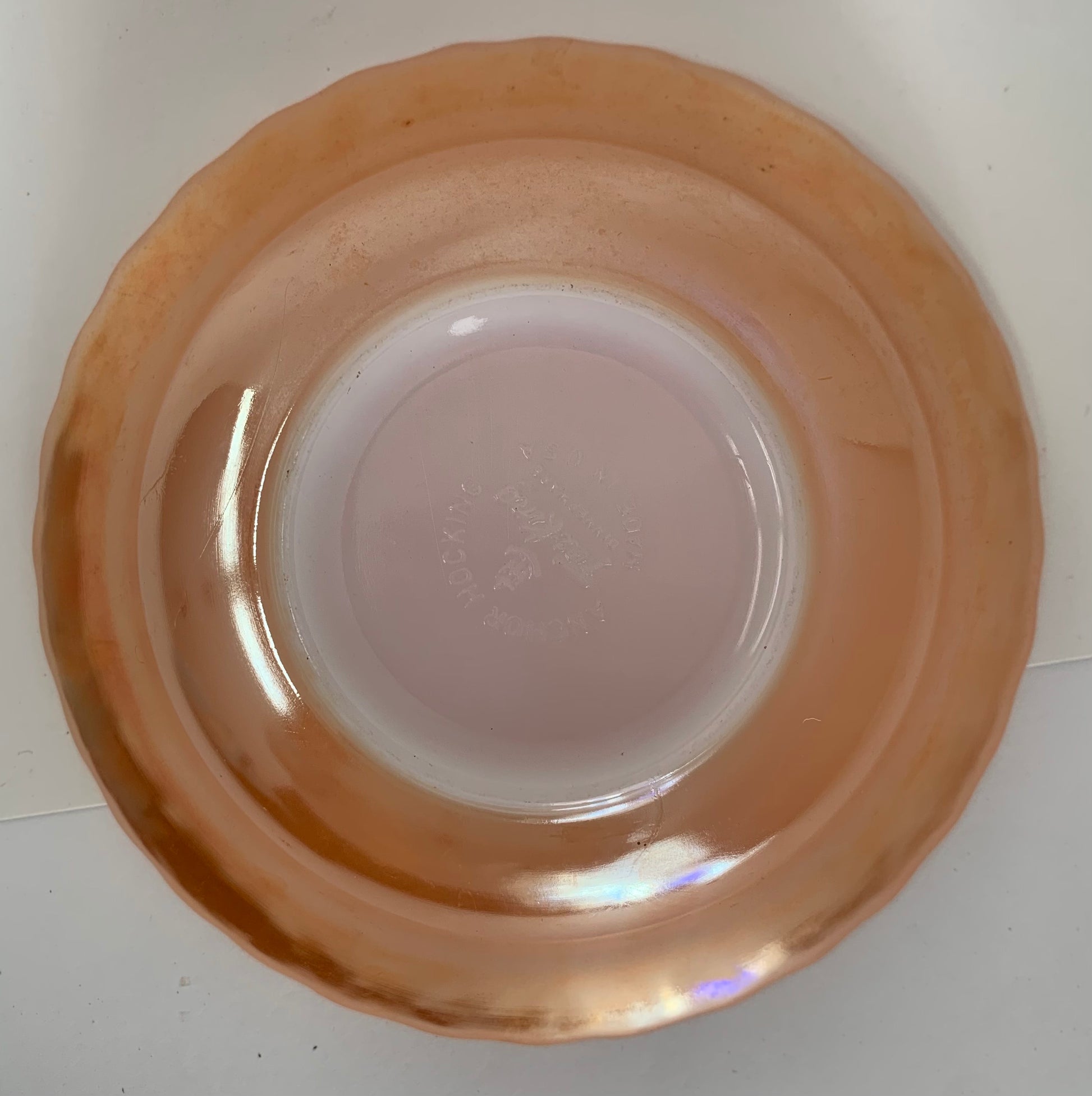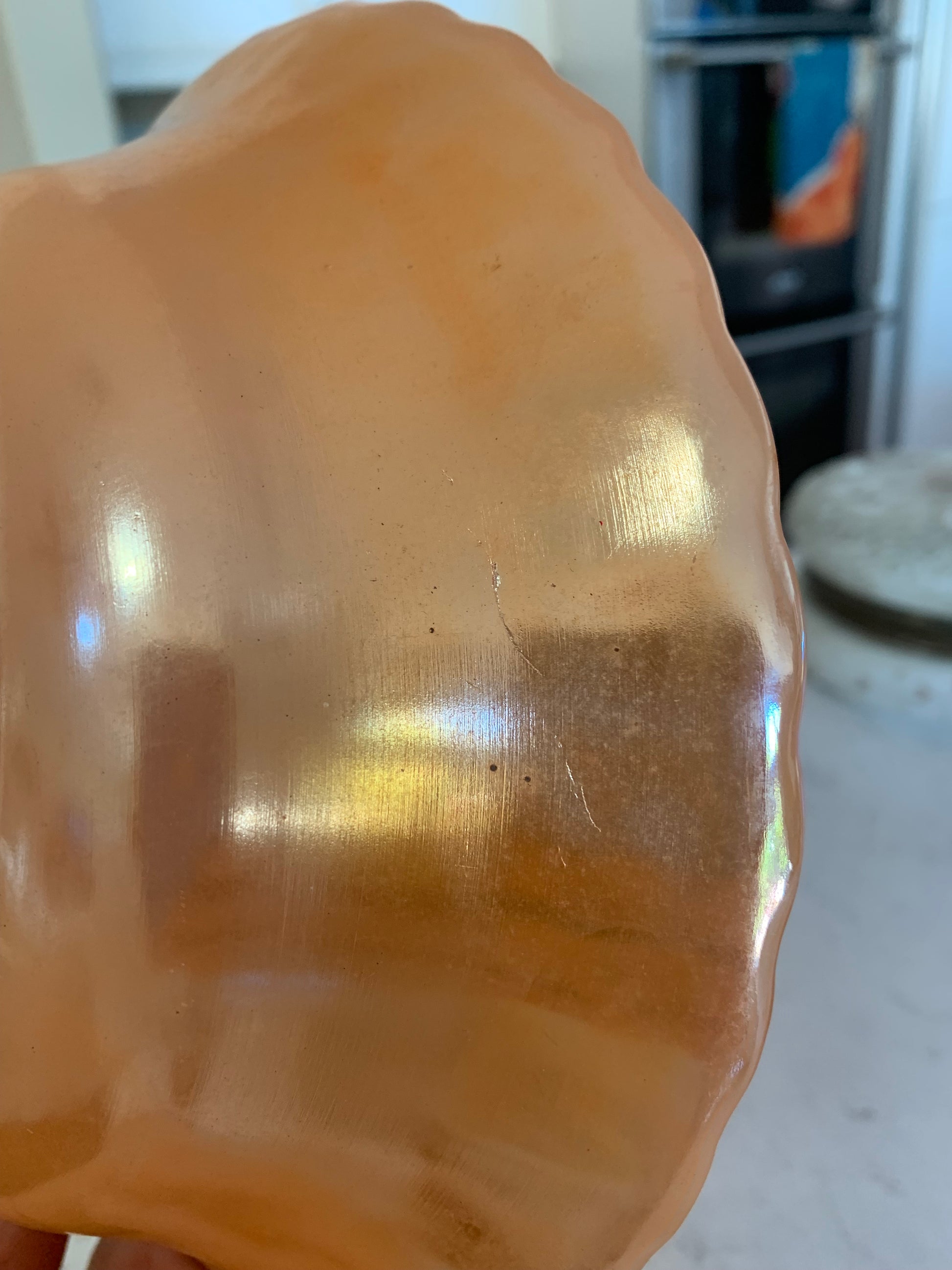 Great piece to add to your Fire King collection, this peach and orangy lustre swirl serving bowl measures 8.5" dia x 2/5"deep. good condition, no cracks or chips, just a small bit of wear on the sides.