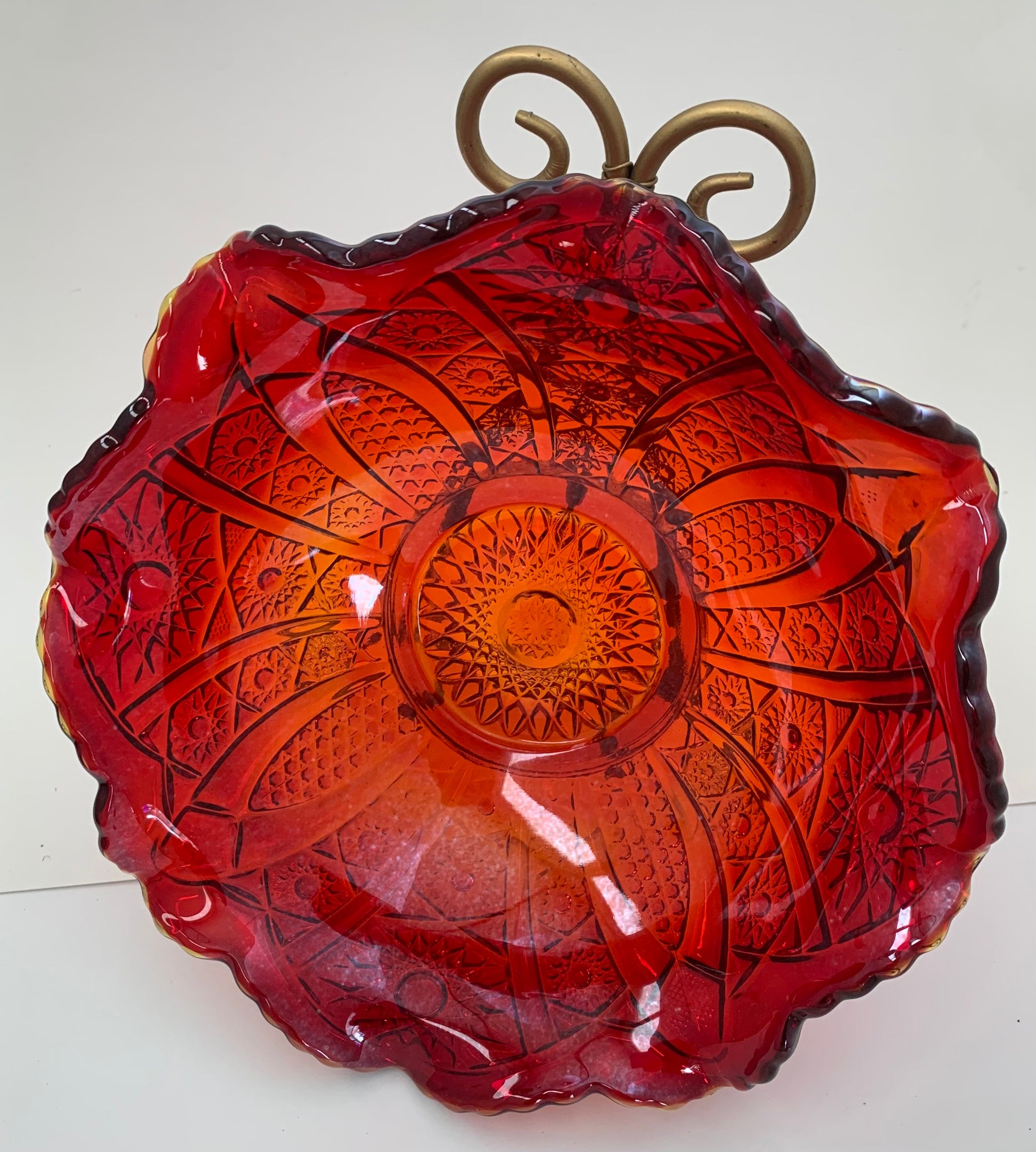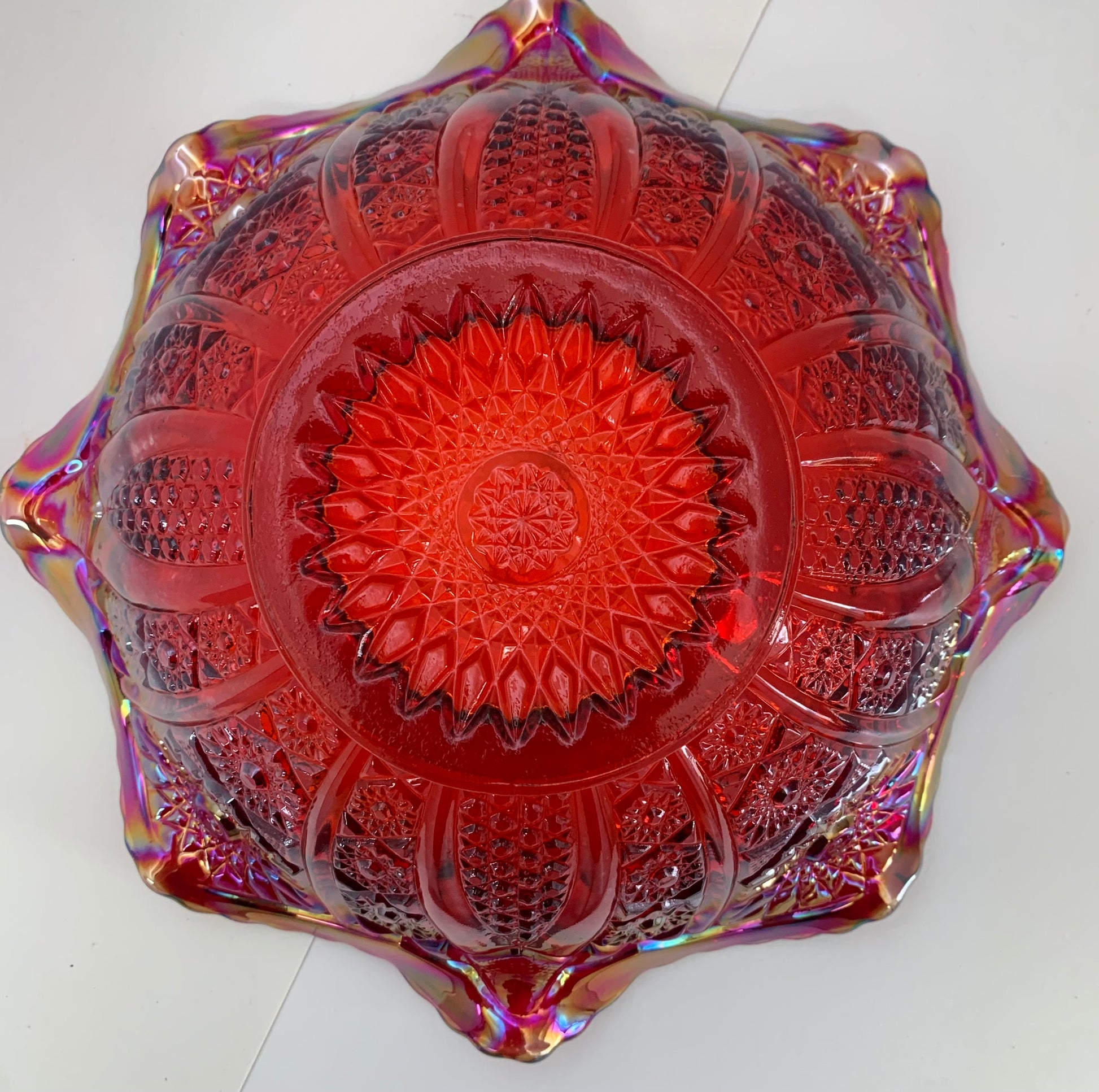 Vintage Indiana Carnival Glass with Ruffled Edge in Iridescent Sunset Red