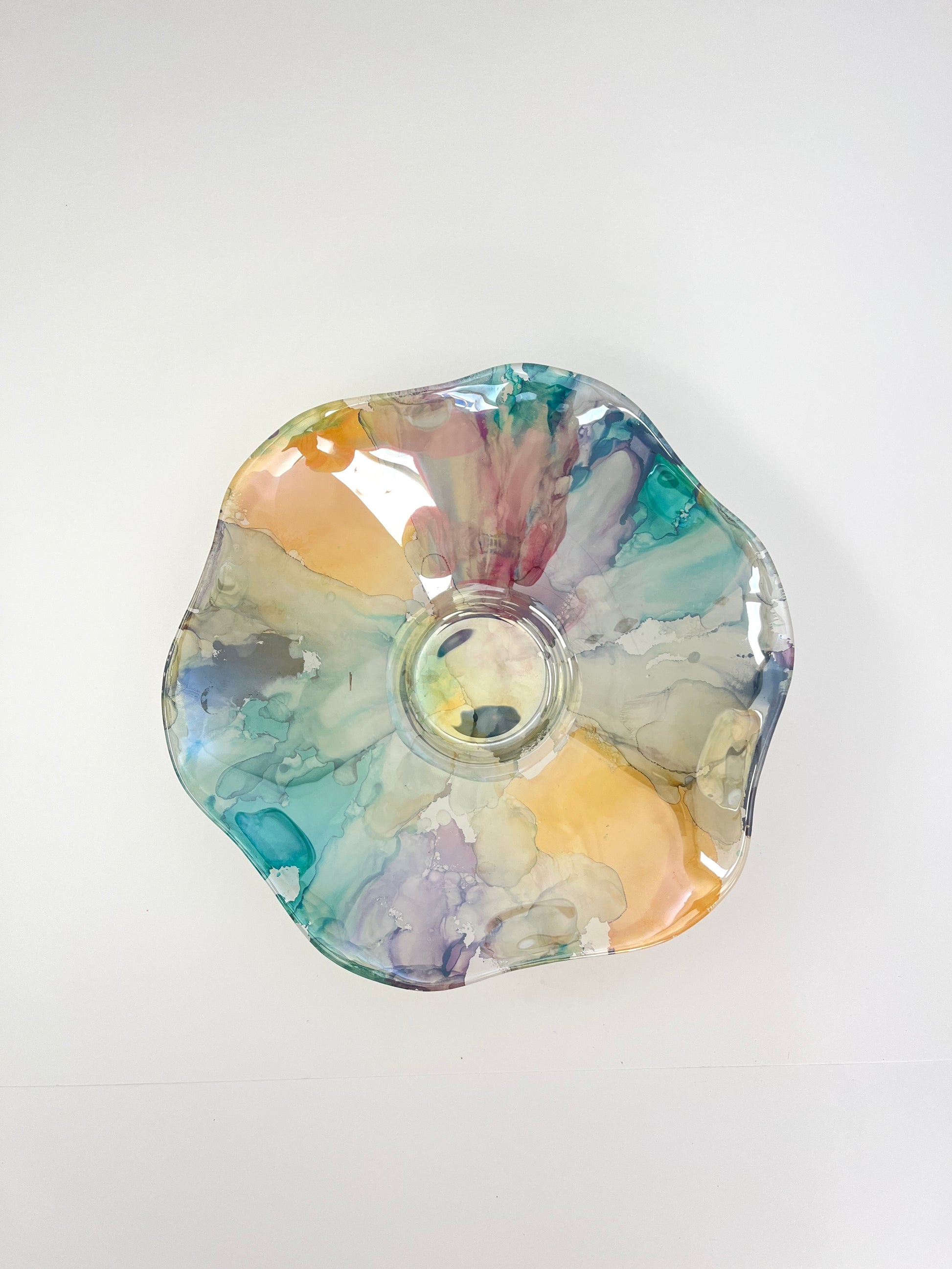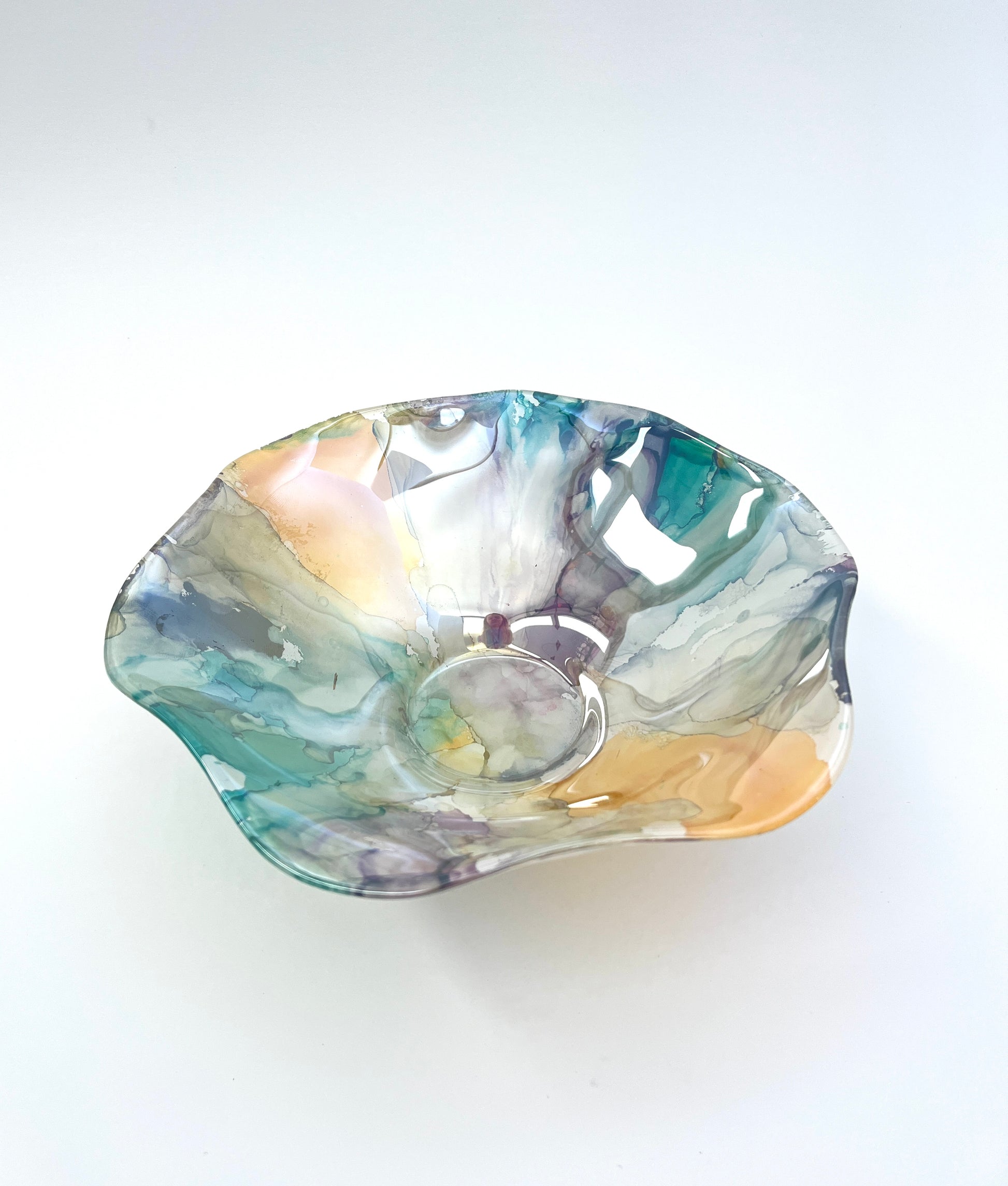 Lovely watercolor glass dish with lustrous glaze, a sort of modern take on carnival glass! Lovely addition to just about any decor but love this for an art deco or modern space especially. Measures 9'Dia b 5" H